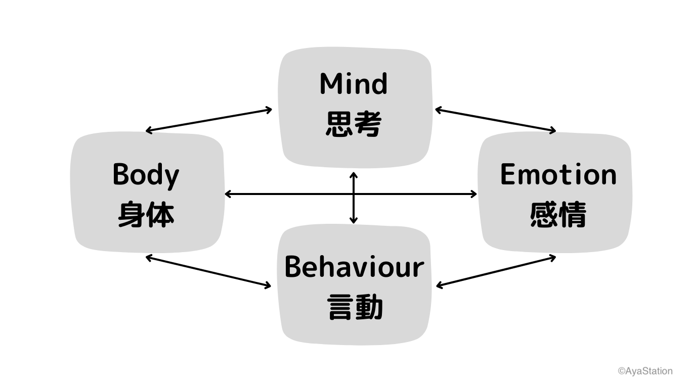 人の構成は、↓こんな感じ。思考、身体、感情、言動の4つがあって、それぞれがお互いに影響を与えあってる。