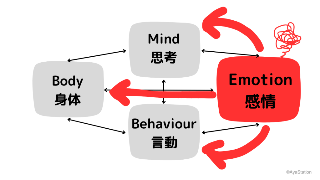 なんかあって気持ちが落ちてると、いいこと考えないし(思考)、元気なくなるし(身体)、ネガティブなこと言ったりする(言動)。自分はもうオシマイダーと思って、体調も悪くなるし、マックを爆食いしたりする。そしてそれがさらに、気持ちを落としていく。負のループ。