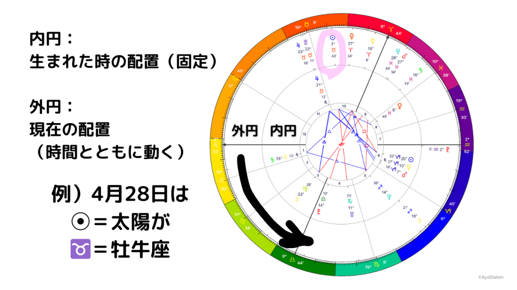 ホロスコープは、太陽系の10天体(太陽、月、水、金、火、木、土、天、海、冥)の配置を表したもの。内円に、その人が生まれたときにどの天体がどの方向にあったか、外円には現在どの天体がどの方向にあるか、が描かれてる。外円を回ってる天体が、内円の天体に並んだとき、影響があると考えられている。