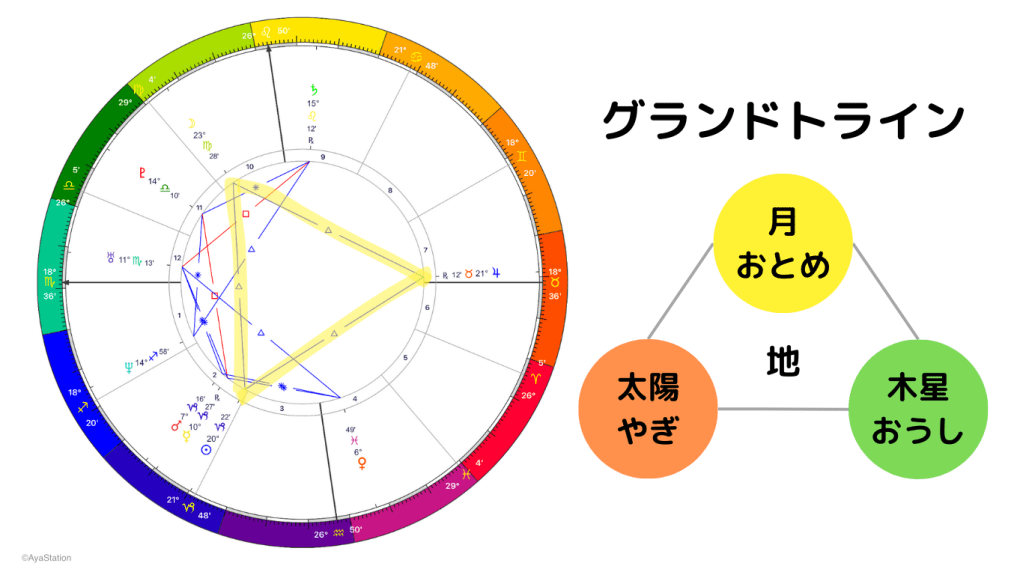 私のホロスコープには、グランドトラインがある。3つの天体がそれぞれ120°の角度でつながっていて、ちょうど正三角形になっている。