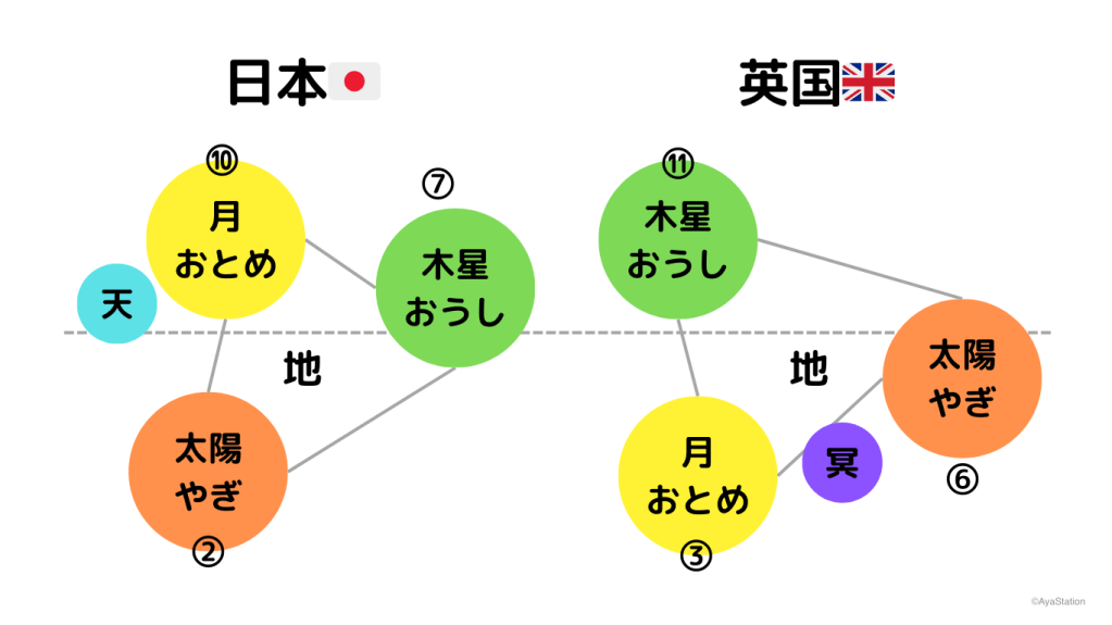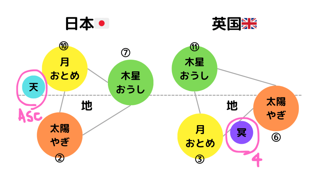 日本だと、上半分に2天体、下半分に1天体。外側に打ち出すことが主眼の人生。イギリスは逆に、自分に取り組むことが主眼になる。